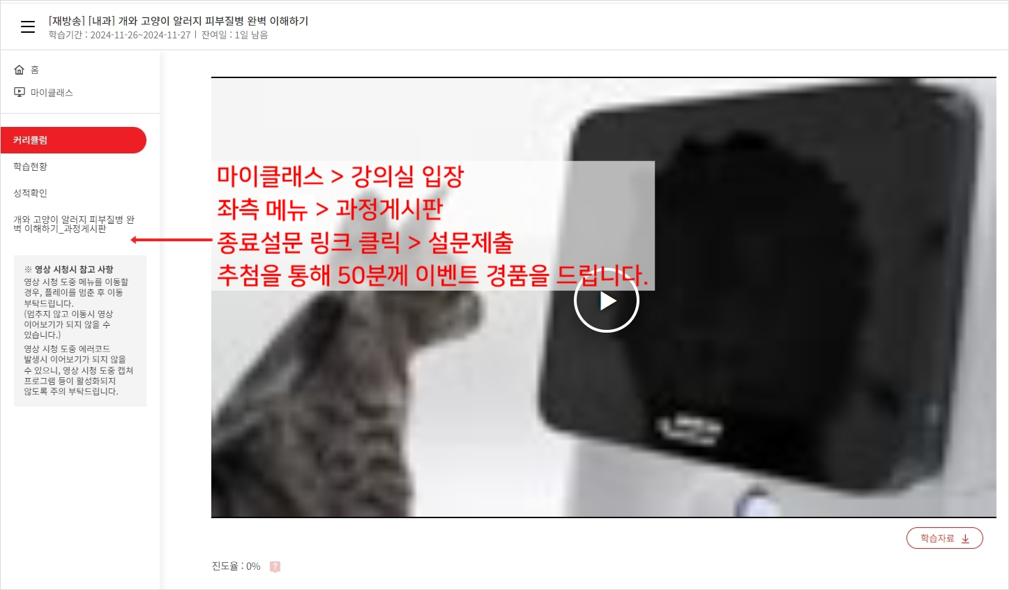 재방송 강의 수강 종료 후, 좌측 과정게시판 종료설문 게시글의 종료설문을 작성/제출해 주시는 분들 중 50분을 추첨하여